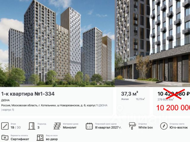 Продается 1-комн. квартира в ЖК Дюна по акции, по цене ниже, чем у застройщика. Квартира расположена на 19 этаже общей площадью 37.3 м2. , жилой 13.7 м2. Высота потолоков 2,7 м Тип строения монолитный Есть грузовой и пассажирские лифты Консьерж, охрана. Дом 1, сдается в первую очередь в 3 квартале 2027 года. Квартира сдается с предчистовой отделкой. Из больших преимуществ: ЖК Дюна расположен рядом с метро Котельники по Новорязанскому шоссе, от метро 10 минут ходьбы пешком. Также рядом находится большой междугородний автовокзал. Внутри ЖК находятся школа, детский сад, поликлиника, магазины. Внутри есть подземный и надземный паркинг. Территория закрытая, посторонние не пройдут. Цена у застройщика при 100% оплате 10 429 080 руб Через наше агентство при тех же условиях, цена 10 200 000 руб. Квартиру можно купить по субсидированной ипотеке по ставке 3,5% при ПВ 20% без переплат и увеличения стоимости. Не упустите шанс купить квартиру по привлекательной цене! 1-комнатная квартира на шоссе Новорязанское в городе Котельники.