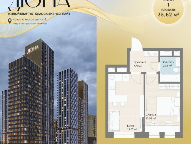 Современный жилой квартал бизнес-класса "Дюна" расположен в 10 минутах ходьбы от станции метро "Котельники" (1,2 км) на пересечении Новорязанского и Дзержинского шоссе. Квартал находится в районе с развитой инфраструктурой: в непосредственной близости расположены школы, детские сады, поликлиники, а также гипермаркеты и торговые комплексы, такие как "Metro", "Глобус", "Лемана Про" (Леруа Мерлен), "МЕГА Белая Дача", "Outlet Village Белая Дача" и другие. В шаговой доступности находятся физкультурно-оздоровительный комплекс с бассейном и теннисными кортами, а также благоустроенный лесопарк "Кузьминки" площадью 1189 га. Неподалёку расположены пляжи Дзержинских карьеров с экстрим-парком и горнолыжными трассами, Томилинский лесопарк с лыжной базой и Жулебинский лесопарк. Застройщик реализует современную урбанистическую концепцию "Город в городе", которая подразумевает наличие собственной полноценной инфраструктуры на территории жилого комплекса, включая школу, детские сады, торговую галерею, бизнес-центр, пункт полиции и медицинский центр. Общая площадь застройки составляет 12,2 га. Квартиры представлены в диапазоне планировок от студий до четырёхкомнатных, в обычном и евроформате. На этажах расположено от 3 до 4 бесшумных скоростных лифтов при количестве квартир от 4 до 7 на этаже. Квартиры сдаются с предчистовой отделкой (white box). Здания переменной этажности строятся по технологии монолит-кирпич, а фасады выполнены с использованием инновационной системы вентилируемого комбинированного фасада.Комфорт на внутренней территории обеспечивается за счёт принципа "двор без машин", системы доступа по карте и круглосуточного видеонаблюдения. Приобрести квартиру можно с использованием материнского капитала, беспроцентной рассрочки или ипотечных программ. При 100% оплате предусмотрены индивидуальные условия. Продам 1-комнатную квартиру в новостройке в Котельниках.