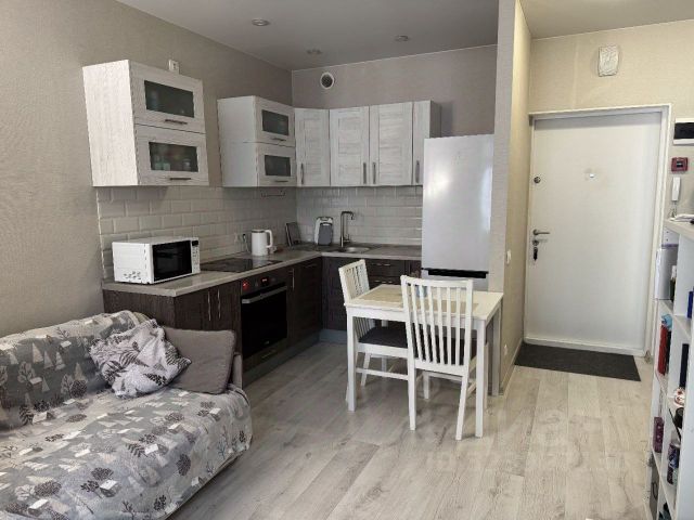 При продаже в квартире остается встроенная кухня, духовой шкаф, варочная поверхность, посудомоечная машина, холодильник, стиральная машинка, кухонный стол и стулья, кровать, диван, шкаф в спальне.