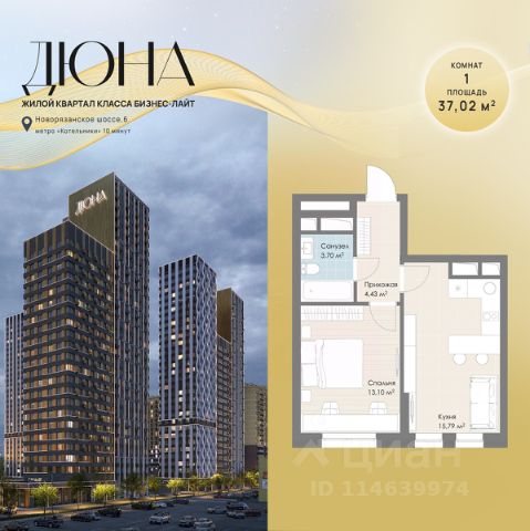Современный жилой квартал бизнес-класса "Дюна" расположен в 10 минутах ходьбы от станции метро "Котельники" (1,2 км) на пересечении Новорязанского и Дзержинского шоссе. Квартал находится в районе с развитой инфраструктурой: в непосредственной близости расположены школы, детские сады, поликлиники, а также гипермаркеты и торговые комплексы, такие как "Metro", "Глобус", "Лемана Про" (Леруа Мерлен), "МЕГА Белая Дача", "Outlet Village Белая Дача" и другие. В шаговой доступности находятся физкультурно-оздоровительный комплекс с бассейном и теннисными кортами, а также благоустроенный лесопарк "Кузьминки" площадью 1189 га. Неподалёку расположены пляжи Дзержинских карьеров с экстрим-парком и горнолыжными трассами, Томилинский лесопарк с лыжной базой и Жулебинский лесопарк. Застройщик реализует современную урбанистическую концепцию "Город в городе", которая подразумевает наличие собственной полноценной инфраструктуры на территории жилого комплекса, включая школу, детские сады, торговую галерею, бизнес-центр, пункт полиции и медицинский центр. Общая площадь застройки составляет 12,2 га. Квартиры представлены в диапазоне планировок от студий до четырёхкомнатных, в обычном и евроформате. На этажах расположено от 3 до 4 бесшумных скоростных лифтов при количестве квартир от 4 до 7 на этаже. Квартиры сдаются с предчистовой отделкой (white box). Здания переменной этажности строятся по технологии монолит-кирпич, а фасады выполнены с использованием инновационной системы вентилируемого комбинированного фасада.Комфорт на внутренней территории обеспечивается за счёт принципа "двор без машин", системы доступа по карте и круглосуточного видеонаблюдения. Приобрести квартиру можно с использованием материнского капитала, беспроцентной рассрочки или ипотечных программ. При 100% оплате предусмотрены индивидуальные условия.
