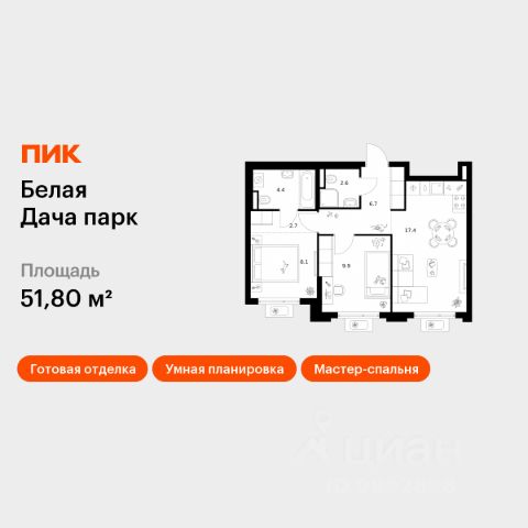 Продаётся 2-комн. квартира площадью 51,3 кв.м на 12 этаже 17 этажного дома (Корпус 22.1, Секция 5) проекта ПИК Белая Дача парк. Светлый просторный подъезд на уровне земли, функциональная планировка, большие окна, c отделкой. "Белая Дача парк" — новый проект в Московской области, в городе Котельники. Квартал расположен в 2 километрах от МКАД и в 7 минутах на автомобиле от метро "Котельники". Уже сейчас вы можете приобрести квартиры с отделкой в готовых и строящихся корпусах. На территории квартала будут построены 22 дома, две школы, поликлиники и пять детских садов. Один из центральных элементов проекта — широкий пешеходный бульвар, где мы создали пространства для спорта, прогулок и отдыха. Яркой точкой притяжения стал ПлейХаб "Ферма" — масштабная игровая зона с домом-мельницей, искусственным ручьём и развивающими элементами для детей. В 2024 году ПлейХаб стал победителем "Всероссийской премии лучших проектов создания игровой среды" и получил награду "Лучшая реализация игровой площадки среди девелоперских проектов". Рядом с кварталом много магазинов и развлекательных центров: "МЕГА Белая дача" и гипермаркет "Глобус". До Люберецких карьеров можно добраться на машине за 9 минут, а до парка "Кузьминки" — за полчаса. Артикул 1055650 (Застройщик АО "СЗ "Новый Горизонт")