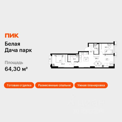 Продаётся 2-комн. квартира площадью 59,4 кв.м на 7 этаже 15 этажного дома (Корпус 19.1, Секция 3) проекта ПИК Белая Дача парк. Светлый просторный подъезд на уровне земли, функциональная планировка, большие окна, c отделкой. "Белая Дача парк" — новый проект в Московской области, в городе Котельники. Квартал расположен в 2 километрах от МКАД и в 7 минутах на автомобиле от метро "Котельники". Уже сейчас вы можете приобрести квартиры с отделкой в готовых и строящихся корпусах. На территории квартала будут построены 22 дома, две школы, поликлиники и пять детских садов. Один из центральных элементов проекта — широкий пешеходный бульвар, где мы создали пространства для спорта, прогулок и отдыха. Яркой точкой притяжения стал PlayHub "Ферма" — масштабная игровая зона с домом-мельницей, искусственным ручьём и развивающими элементами для детей. В 2024 году PlayHub стал победителем "Всероссийской премии лучших проектов создания игровой среды" и получил награду "Лучшая реализация игровой площадки среди девелоперских проектов". Рядом с кварталом много магазинов и развлекательных центров: "Outlet Village Белая дача", "МЕГА Белая дача", гипермаркет "Глобус", центр оптовой торговли Selgros. До Люберецких карьеров можно добраться на машине за 9 минут, а до парка "Кузьминки" — за полчаса. Артикул 566779 (Застройщик АО "СЗ "Новый Горизонт") Купить 2-комнатную квартиру в ипотеку в новостройке в Котельниках.