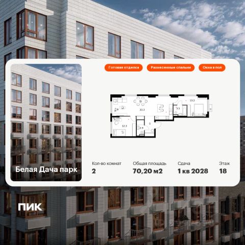 Продаётся 2-комн. квартира площадью 50,4 кв.м на 8 этаже 25 этажного дома (Корпус 16.2, Секция 5) проекта ПИК Белая Дача парк. Светлый просторный подъезд на уровне земли, функциональная планировка, большие окна, c отделкой. "Белая Дача парк" — новый проект в Московской области, в городе Котельники. Квартал расположен в 2 километрах от МКАД и в 7 минутах на автомобиле от метро "Котельники". Уже сейчас вы можете приобрести квартиры с отделкой в готовых и строящихся корпусах. На территории квартала будут построены 22 дома, две школы, поликлиники и пять детских садов. Один из центральных элементов проекта — широкий пешеходный бульвар, где мы создали пространства для спорта, прогулок и отдыха. Яркой точкой притяжения стал PlayHub "Ферма" — масштабная игровая зона с домом-мельницей, искусственным ручьём и развивающими элементами для детей. В 2024 году PlayHub стал победителем "Всероссийской премии лучших проектов создания игровой среды" и получил награду "Лучшая реализация игровой площадки среди девелоперских проектов". Рядом с кварталом много магазинов и развлекательных центров: "Outlet Village Белая дача", "МЕГА Белая дача", гипермаркет "Глобус", центр оптовой торговли Selgros. До Люберецких карьеров можно добраться на машине за 9 минут, а до парка "Кузьминки" — за полчаса. Артикул 1008385 (Застройщик АО "СЗ "Новый Горизонт") Купить 2-комнатную квартиру с отделкой в Котельниках.
