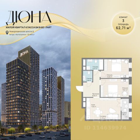 Продается трехкомнатная квартира 72 в новостройке ЖК "Котельники парк" по адресу Московская область, г. Дзержинский, мкр. Новые Котельники, корп. 12. Общая площадь квартиры - 74.00 кв. м., этаж 14 из 25, секция 1. Стоимость квартиры - 13811104 Р. Срок сдачи - 4 квартал 2026 года. Более подробная информация по телефону. Динамичный проект "Котельники Парк" возводится на берегу Дзержинского карьера, в окружении зеленых просторов Томилинского лесопарка. В 2 км от комплекса есть удобный съезд на МКАД, а станция метро "Котельники" расположена в 15 минутах езды по Новорязанскому шоссе. Выдающаяся архитектура проекта особенно выделяется в темное время суток благодаря фасадной подсветке. Атмосферные лобби с мягкой мебелью и декором оснащены видеокамерами, дополнительным преимуществом являются передовые технологии, обеспечивающие безопасность и приватность. "Котельники Парк" - это отличный выбор для всей семьи. Дворы, закрытые от машин, станут новым местом притяжения для досуга детей и взрослых. Мощеные пешеходные тропинки, игровые и спортивные кластеры, комьюнити-пространства для подростков, лаунж-зоны с перголами - все элементы благоустройства продуманы для жителей комплекса. Оставить автомобиль можно будет в теплом паркинге, на двух подземных уровнях которого также оборудуют келлеры для хранения. В ближайшей округе проекта есть множество культурных мест, среди которых уютный парк "Братеевская пойма", музей-усадьба "Кузьминки" и сквер Победы у Николо-Угрешского монастыря. На территории запланировано строительство частного детского сада и школы, рядом откроется медицинский центр и торговый комплекс.