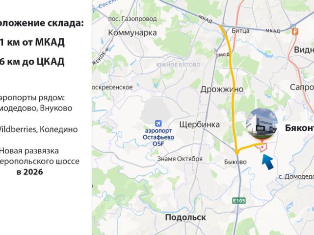 В продаже склад второй очереди 4 квартал 2026 года. Общая информация • Склад 1422 метра по полу. 100 метров мезонин для организации офиса. • Земля 25 соток (не только пятно здания). • Доставка сотрудников, уборка территории, охрана, обслуживание промышленного парка организуется через УК. • Честная УК, бюджет согласован с резидентами. • Электричество: 50 кВт (мощности увеличить есть) • Сдача - 4 кв. 2026 • Условия рассрочки индивидуально Характеристики • Высота рабочая: 8 м. • Ворота: 2 доковых. • Полы: антипыль 5 т/м². • Панели: минвата 120 мм, ГОСТ 1 класс (Техностиль). • Кровля: мембрана SMART PIR (Технониколь). • Ворота: DoorHan (автоматические), гидроборт. • Выводы под СКУД, кондиционирование, подойдет для фармацевтики, алкогольной лицензии. Локация • 13.5 км до МКАД по новой развязке, 20 км до ЦКАД. • Новая развязка к Симферопольскому (готовность 2026). • Соседи — логистические гиганты (Wildberries, Коледино, Магнит).