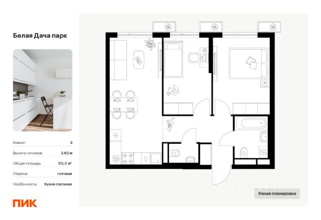 просторная кухнягостиная (24,2 м²) — идеальное место для семейных вечеров и приёмов гостей;