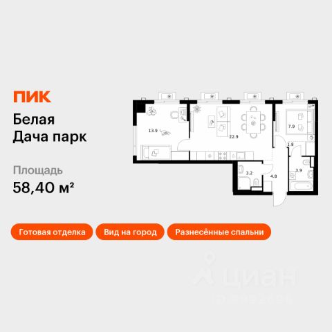 Продаётся 2-комн. квартира площадью 58,4 кв.м на 5 этаже 17 этажного дома (Корпус 22.2, Секция 10) проекта ПИК Белая Дача парк. Светлый просторный подъезд на уровне земли, функциональная планировка, большие окна, c отделкой. "Белая Дача парк" — новый проект в Московской области, в городе Котельники. Квартал расположен в 2 километрах от МКАД и в 7 минутах на автомобиле от метро "Котельники". Уже сейчас вы можете приобрести квартиры с отделкой в готовых и строящихся корпусах. На территории квартала будут построены 22 дома, две школы, поликлиники и пять детских садов. Один из центральных элементов проекта — широкий пешеходный бульвар, где мы создали пространства для спорта, прогулок и отдыха. Яркой точкой притяжения стал ПлейХаб "Ферма" — масштабная игровая зона с домом-мельницей, искусственным ручьём и развивающими элементами для детей. В 2024 году ПлейХаб стал победителем "Всероссийской премии лучших проектов создания игровой среды" и получил награду "Лучшая реализация игровой площадки среди девелоперских проектов". Рядом с кварталом много магазинов и развлекательных центров: "МЕГА Белая дача" и гипермаркет "Глобус". До Люберецких карьеров можно добраться на машине за 9 минут, а до парка "Кузьминки" — за полчаса. Артикул 1056426 (Застройщик АО "СЗ "Новый Горизонт") Продам квартиру 60 м2 (квадратных метров) в Котельниках.
