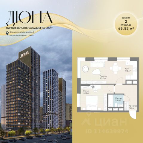 Современный жилой квартал бизнес-класса "Дюна" расположен в 10 минутах ходьбы от станции метро "Котельники" (1,2 км) на пересечении Новорязанского и Дзержинского шоссе. Квартал находится в районе с развитой инфраструктурой: в непосредственной близости расположены школы, детские сады, поликлиники, а также гипермаркеты и торговые комплексы, такие как "Metro", "Глобус", "Лемана Про" (Леруа Мерлен), "МЕГА Белая Дача", "Outlet Village Белая Дача" и другие. В шаговой доступности находятся физкультурно-оздоровительный комплекс с бассейном и теннисными кортами, а также благоустроенный лесопарк "Кузьминки" площадью 1189 га. Неподалёку расположены пляжи Дзержинских карьеров с экстрим-парком и горнолыжными трассами, Томилинский лесопарк с лыжной базой и Жулебинский лесопарк. Застройщик реализует современную урбанистическую концепцию "Город в городе", которая подразумевает наличие собственной полноценной инфраструктуры на территории жилого комплекса, включая школу, детские сады, торговую галерею, бизнес-центр, пункт полиции и медицинский центр. Общая площадь застройки составляет 12,2 га. Квартиры представлены в диапазоне планировок от студий до четырёхкомнатных, в обычном и евроформате. На этажах расположено от 3 до 4 бесшумных скоростных лифтов при количестве квартир от 4 до 7 на этаже. Квартиры сдаются с предчистовой отделкой (white box). Здания переменной этажности строятся по технологии монолит-кирпич, а фасады выполнены с использованием инновационной системы вентилируемого комбинированного фасада.Комфорт на внутренней территории обеспечивается за счёт принципа "двор без машин", системы доступа по карте и круглосуточного видеонаблюдения. Приобрести квартиру можно с использованием материнского капитала, беспроцентной рассрочки или ипотечных программ. При 100% оплате предусмотрены индивидуальные условия.