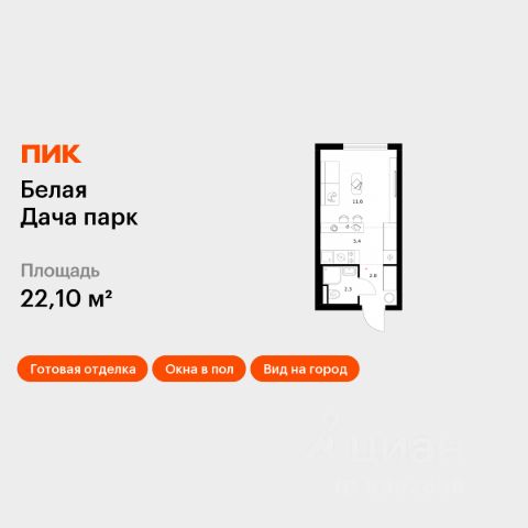 Продаётся квартира-студия площадью 22,1 кв.м на 20 этаже 20 этажного дома (Корпус 16.2, Секция 7) проекта ПИК Белая Дача парк. Светлый просторный подъезд на уровне земли, функциональная планировка, большие окна, c отделкой. "Белая Дача парк" — новый проект в Московской области, в городе Котельники. Квартал расположен в 2 километрах от МКАД и в 7 минутах на автомобиле от метро "Котельники". Уже сейчас вы можете приобрести квартиры с отделкой в готовых и строящихся корпусах. На территории квартала будут построены 22 дома, две школы, поликлиники и пять детских садов. Один из центральных элементов проекта — широкий пешеходный бульвар, где мы создали пространства для спорта, прогулок и отдыха. Яркой точкой притяжения стал PlayHub "Ферма" — масштабная игровая зона с домом-мельницей, искусственным ручьём и развивающими элементами для детей. В 2024 году PlayHub стал победителем "Всероссийской премии лучших проектов создания игровой среды" и получил награду "Лучшая реализация игровой площадки среди девелоперских проектов". Рядом с кварталом много магазинов и развлекательных центров: "Outlet Village Белая дача", "МЕГА Белая дача", гипермаркет "Глобус", центр оптовой торговли Selgros. До Люберецких карьеров можно добраться на машине за 9 минут, а до парка "Кузьминки" — за полчаса. Артикул 1008977 (Застройщик АО "СЗ "Новый Горизонт")