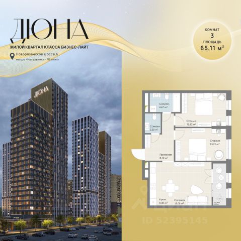 Современный жилой квартал бизнес-класса "Дюна" расположен в 10 минутах ходьбы от станции метро "Котельники" (1,2 км) на пересечении Новорязанского и Дзержинского шоссе. Квартал находится в районе с развитой инфраструктурой: в непосредственной близости расположены школы, детские сады, поликлиники, а также гипермаркеты и торговые комплексы, такие как "Metro", "Глобус", "Лемана Про" (Леруа Мерлен), "МЕГА Белая Дача", "Outlet Village Белая Дача" и другие. В шаговой доступности находятся физкультурно-оздоровительный комплекс с бассейном и теннисными кортами, а также благоустроенный лесопарк "Кузьминки" площадью 1189 га. Неподалёку расположены пляжи Дзержинских карьеров с экстрим-парком и горнолыжными трассами, Томилинский лесопарк с лыжной базой и Жулебинский лесопарк. Застройщик реализует современную урбанистическую концепцию "Город в городе", которая подразумевает наличие собственной полноценной инфраструктуры на территории жилого комплекса, включая школу, детские сады, торговую галерею, бизнес-центр, пункт полиции и медицинский центр. Общая площадь застройки составляет 12,2 га. Квартиры представлены в диапазоне планировок от студий до четырёхкомнатных, в обычном и евроформате. На этажах расположено от 3 до 4 бесшумных скоростных лифтов при количестве квартир от 4 до 7 на этаже. Квартиры сдаются с предчистовой отделкой (white box). Здания переменной этажности строятся по технологии монолит-кирпич, а фасады выполнены с использованием инновационной системы вентилируемого комбинированного фасада.Комфорт на внутренней территории обеспечивается за счёт принципа "двор без машин", системы доступа по карте и круглосуточного видеонаблюдения. Приобрести квартиру можно с использованием материнского капитала, беспроцентной рассрочки или ипотечных программ. При 100% оплате предусмотрены индивидуальные условия.