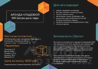 Нужно освободить квартиру от сезонных и крупногабаритных вещей? Сдаётся удобная кладовая в ЖК Белая дача парк (Котельники, Московская область) — мкр. Парковый, 2, секция 5, этаж 1, помещение 14.
