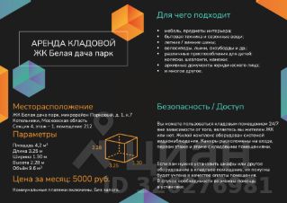 Ищете место, где можно хранить вещи без захламления квартиры? Сдаётся удобная кладовая в ЖК Белая дача парк (Котельники, МО) — секция 4, этаж 1, помещение 212.
