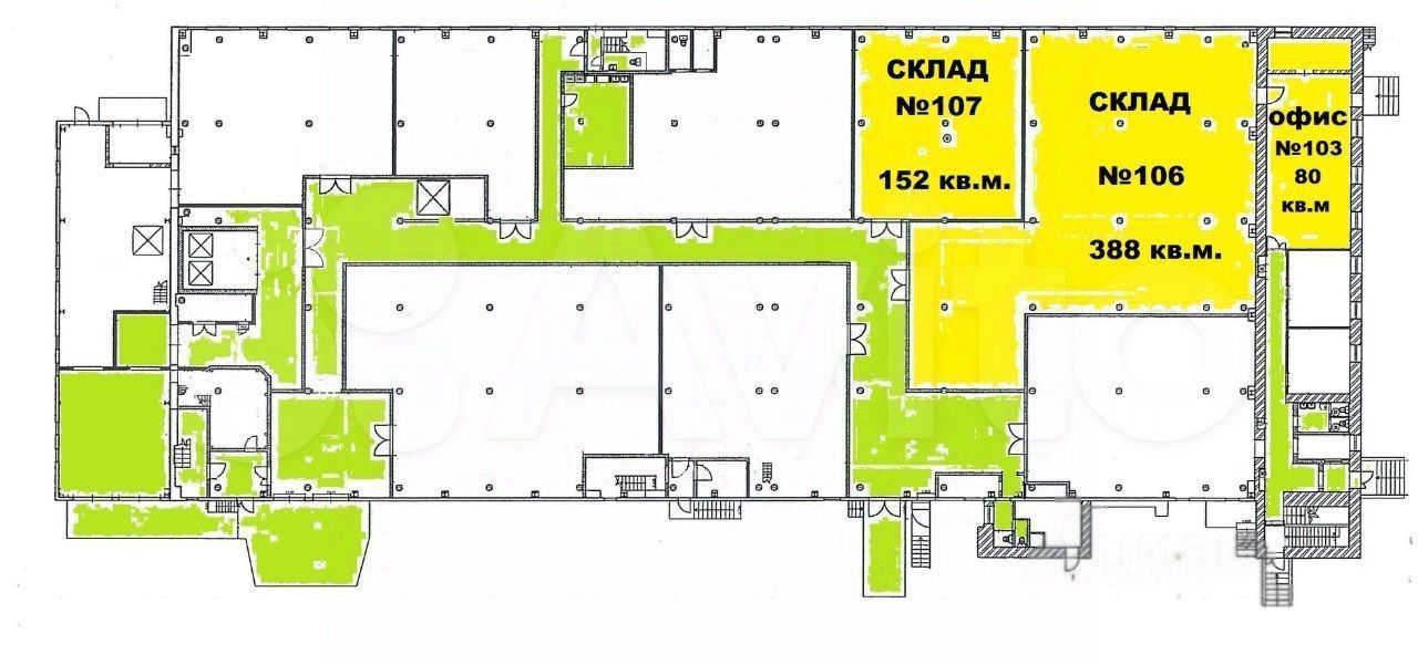 Площадь: 540 м² сам склад (разделен на два крыла) и еще 80 м² офиса-шоурума. Все помещения соединены между собой.