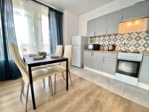 - Полноценная кухня (электроплита, холодильник, микроволновка, чайник)