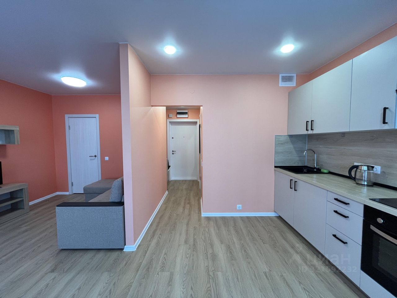 Общая площадь квартиры составляет 33.8 кв. м, жилая площадь — 14 кв. м, просторная кухня 10.4 кв. м. Квартира расположена на 13 этаже 25-этажного дома, построенного в 2025