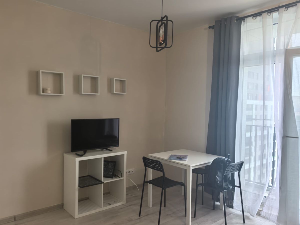 В квартире есть все необходимое для комфортного проживания. Пространство студии оформлено в современном стиле, мебель подобрана в тон и расположена как в комнате, так и на кухне. Для вашего удобства установлены холодильник, телевизор и стиральная машина. Санузел совмещенный, с ванной, что особенно удобно для расслабляющих вечеров.