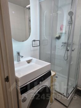 Санузел совмещенный, включает в себя: электрический полотенцесушитель, зеркало-шкаф с подсветкой, стиральная машина, душевой уголок и тумбу для хранения.