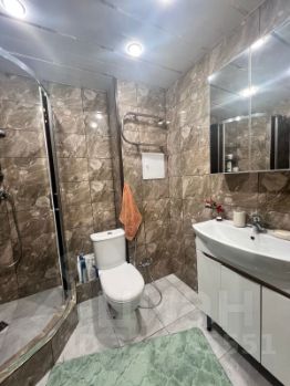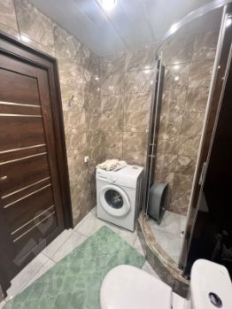 Ванная комната обложена плиткой. Тонированная душевая кабина, раковина с тумбой и зеркалом. Стиральная машина, унитаз , гигиенический душ.