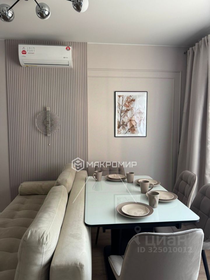 Кухня-гостиная: Большой раздвижной стеклянный обеденный стол, стулья, диван, телевизор (можно приобрести в счёт аренды), кондиционер.