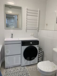 Санузел, выполнены в светлых тонах, оснащен современной сантехникой и стиральной машиной.