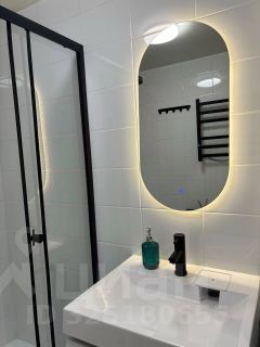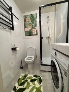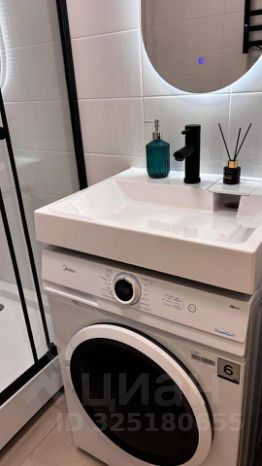 Ванная комната оборудована прочной душевой кабиной, современной стиральной машиной с большой накладной раковиной из литьевого мрамора, зеркалом с несколькими режимами подсветки и электрическим полотенцесушителем, крючками и полками. Чистящие средства для ухода за квартирой также предоставим.