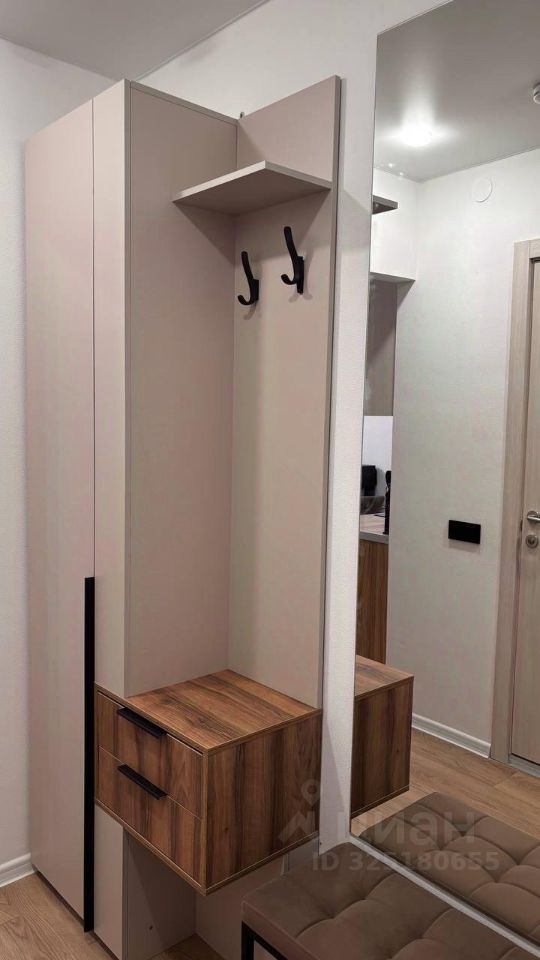В зоне отдыха расположились диван-кровать Аскона с независимым пружинным блоком и полноценным двуспальным местом, 50ти дюймовый телевизор с функцией Smart TV, тумба с технологией push-to open, вместительный трехдверный распашной шкаф с антресолью, а также полочки для мелочей. Из просторных окон квартиры открываются приятные виды на район с высоты 21 этажа.
