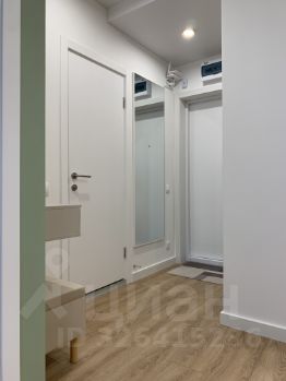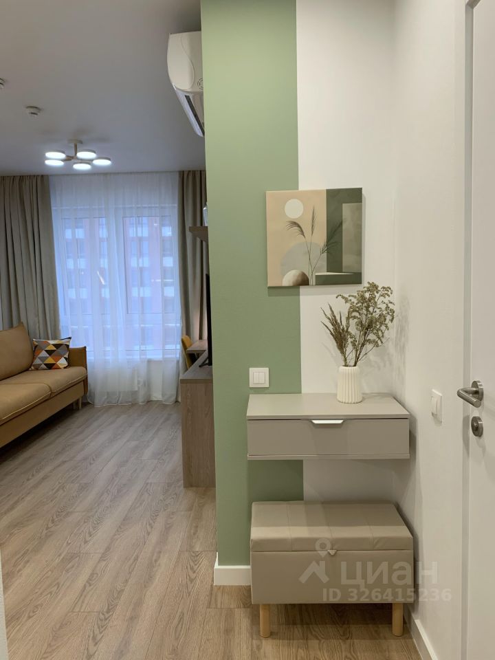 В прихожей находится встроенная система хранения, большое зеркало и тумба с пуфом.