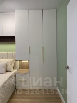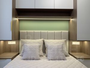 Спальня оснащена большой встроенной системой хранения с подсветкой, кроватью с подъемным механизмом и пружинным матрасом, шторами блэкаут.