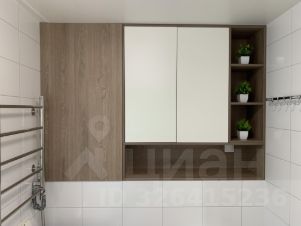 Ванная комната оснащена стиральной машиной, зеркалом с подогревом, электрическим полотенцесушителем, столешницей с интегрированной раковиной и тумбой, встроенным шкафом в нише.