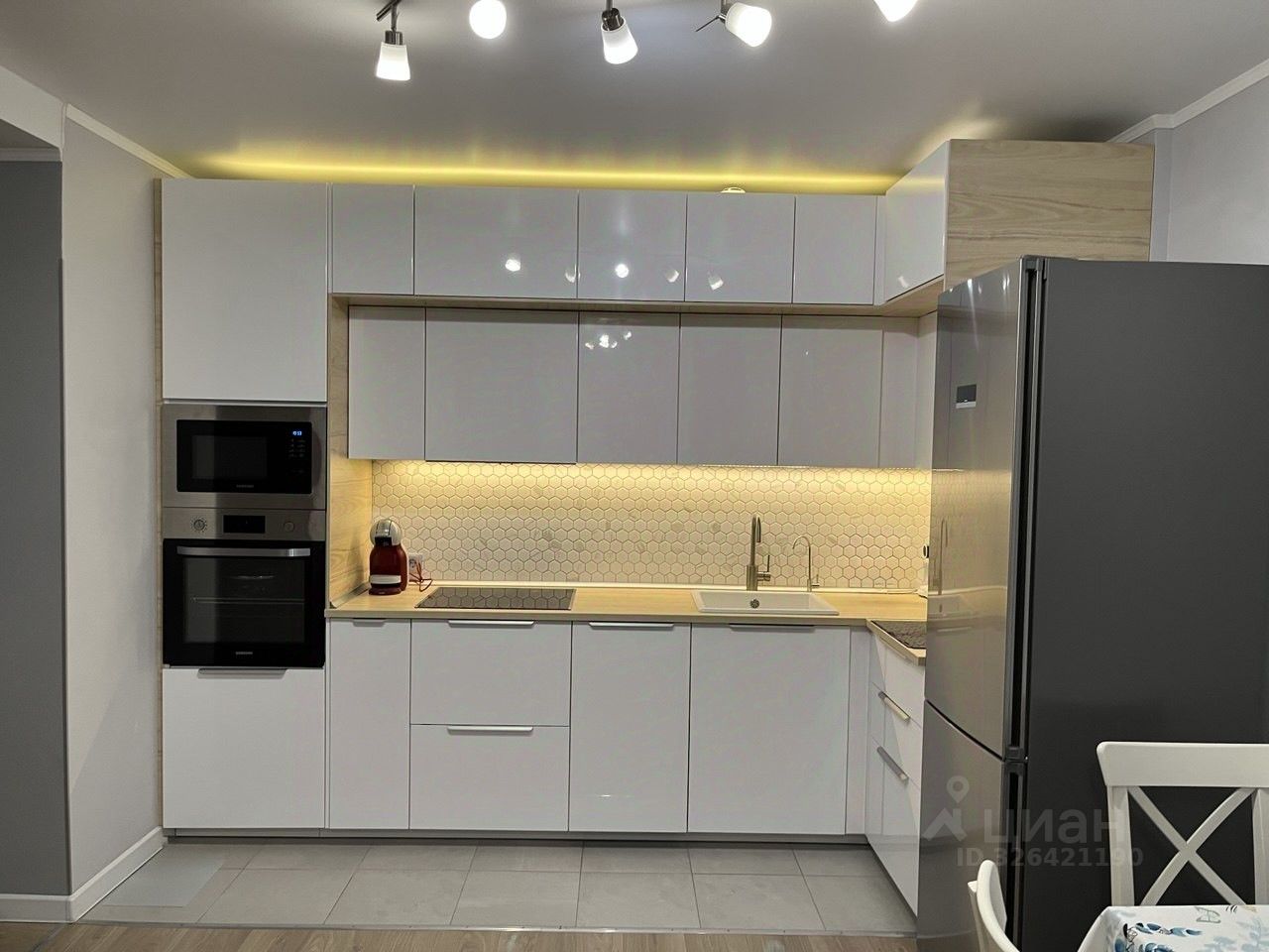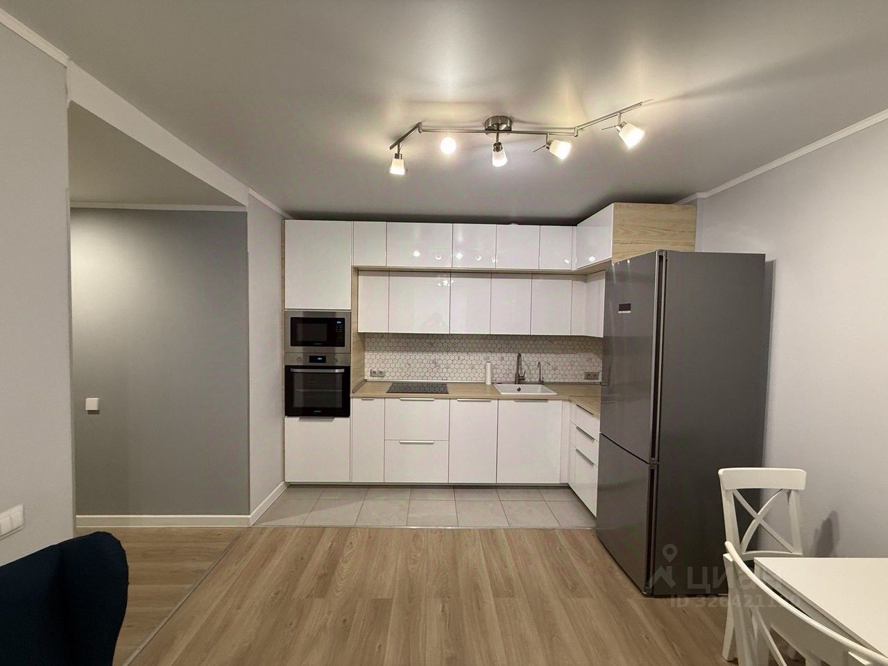 • кухонный гарнитур со встроенной техникой (микроволновая печь, посудомоечная машина, электрическая варочная панель, духовой шкаф), двухкамерный холодильник