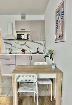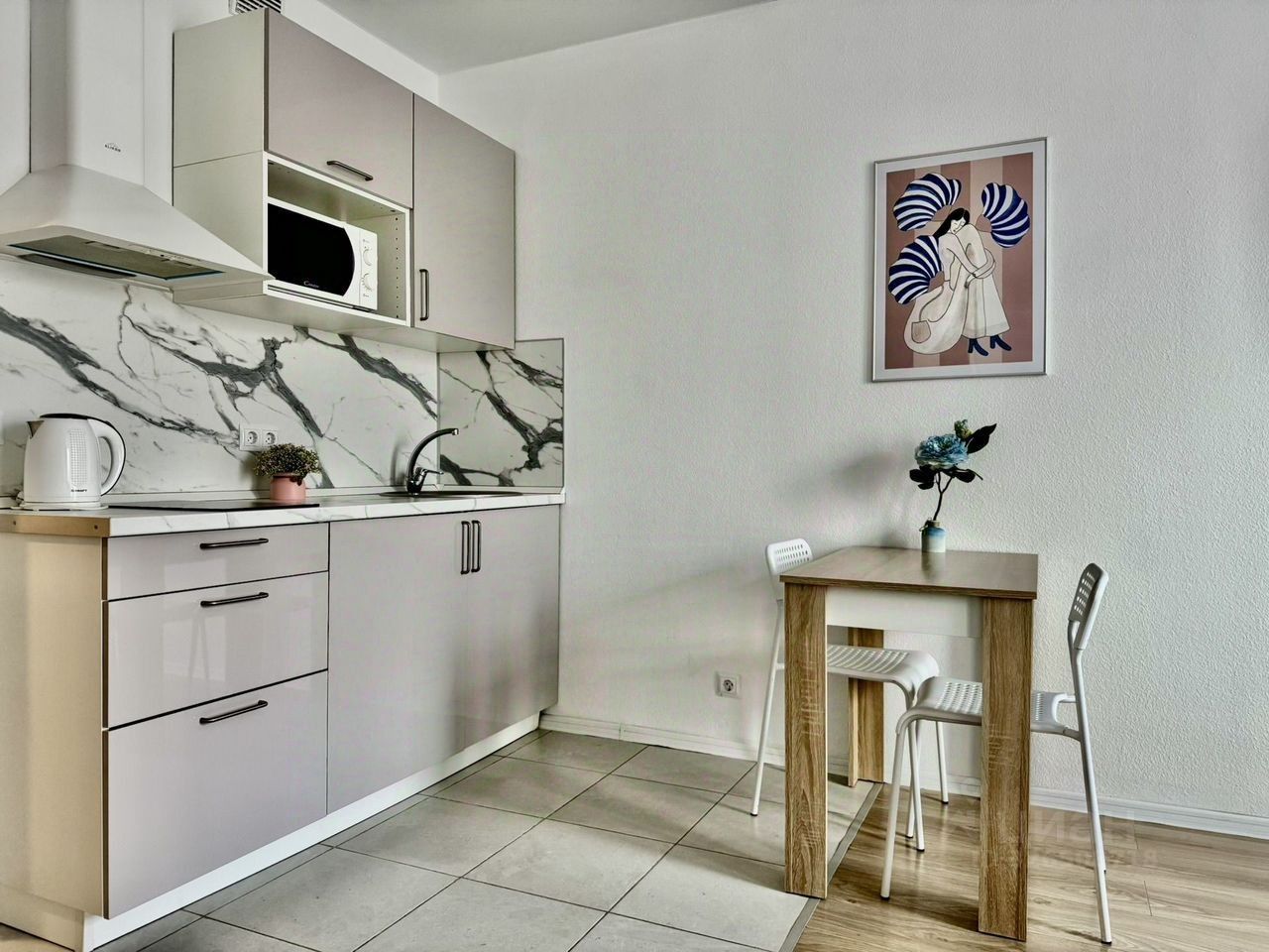 Кухня полностью оборудована: индукционная плита, микроволновка, чайник, стиральная машина, холодильник, красивая посуда и всё необходимое для готовки.