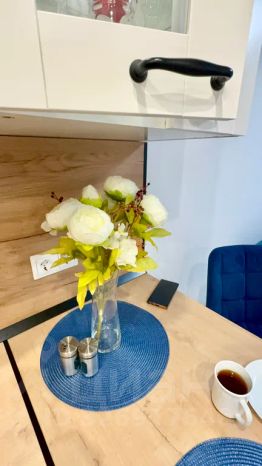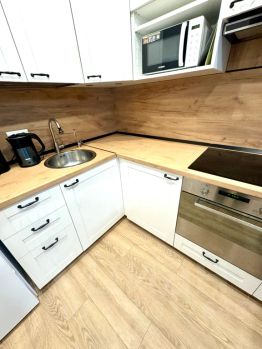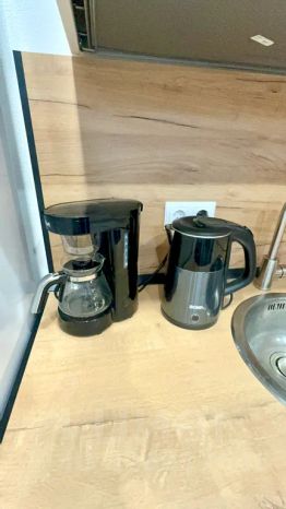 - Плита, духовой шкаф, холодильник, микроволновая печь, чайник, кофеварка, набор посуды