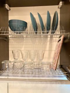 - плита, духовой шкаф, холодильник, микроволновая печь, чайник, набор посуды