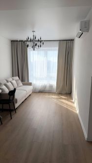 В квартире сделан дизайнерский ремонт, что создаёт атмосферу комфорта и стиля. Здесь есть всё необходимое: на кухне и в комнате расположена мебель, установлены кондиционер, холодильник, посудомоечная и стиральная машины. В ванной комнате — ванна, где можно расслабиться после трудового дня. Совмещённый санузел добавляет удобства.
