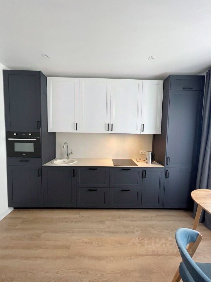 Стильная кухня с всроенной техникой, духовой шкаф с функцией микроволновки, индукционная варочная панель.