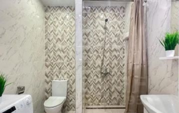 Душевая кабина, стиральная машина, сушилка для белья, утюг, фен, одноразовые тапочки, гель для душа, шампунь. Уборка, бельё и полотенца включены в стоимость.