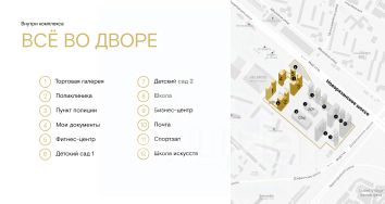 -концепция "Город в городе": собственные школа, детсады, поликлиника, бизнес-центр, фитнес-центр, торговая галерея и гипермаркеты ("Metro", "Глобус"), ТЦ "Мега", зоны отдыха с пляжами и лесопарками;