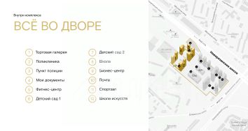 -концепция "Город в городе": собственные школа, детсады, поликлиника, бизнес-центр, фитнес-центр, торговая галерея и гипермаркеты ("Metro", "Глобус"), ТЦ "Мега", зоны отдыха с пляжами и лесопарками;