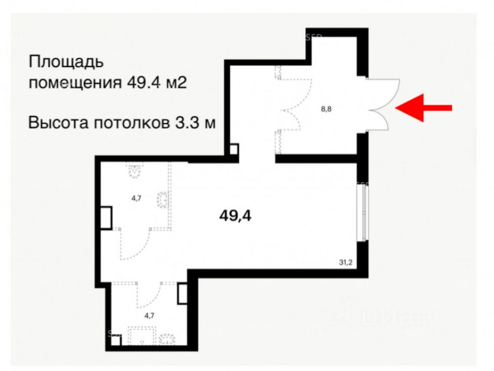 1 этаж 25-ти этажного жилого дома, общей площадью 49.4 м², высота потолков 3.3 м, электрическая мощность 9 кВт, отдельная входная группа, витринное остекление, зальная планировка, первая линия.