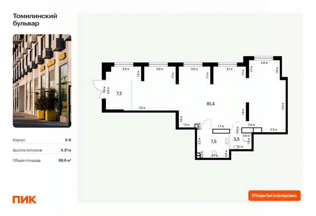 - Открытая планировка, возможно объединить несколько помещений