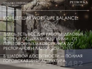 Концепция Work-Life Balance В БЦ предусмотрены переговорные комнаты, коворкинг-зоны, рестораны и уютные лаунжи. Рядом — жилые кварталы, торговые центры, школы и вся необходимая инфраструктура.