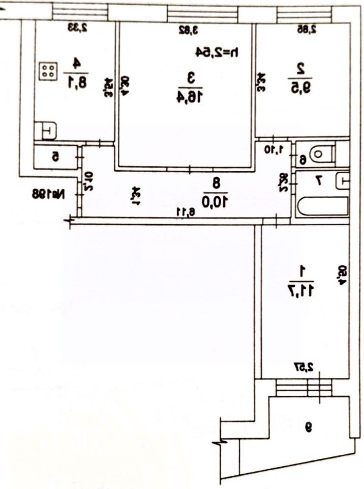 Площадь комнат 16.7м, 12.7м, 9.5м, кухня 8.2.