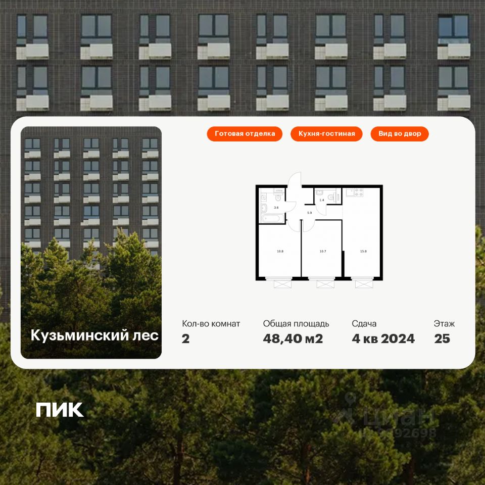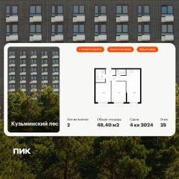 Продаётся 2-комн. квартира площадью 48,4 кв.м на 25 этаже 25 этажного дома (Корпус 11, Секция 1) проекта ПИК Кузьминский лес. Светлый просторный подъезд на уровне земли, функциональная планировка, большие окна, c отделкой.