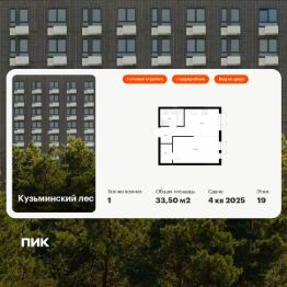 Продаётся 1-комн. квартира площадью 33,5 кв.м на 19 этаже 25 этажного дома (Корпус 9, Секция 1) проекта ПИК Кузьминский лес. Светлый просторный подъезд на уровне земли, функциональная планировка, большие окна, c отделкой.