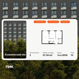 Продаётся 2-комн. квартира площадью 57,3 кв.м на 13 этаже 25 этажного дома (Корпус 9, Секция 1) проекта ПИК Кузьминский лес. Светлый просторный подъезд на уровне земли, функциональная планировка, большие окна, c отделкой.