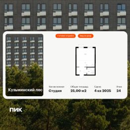 Продаётся квартира-студия площадью 25 кв.м на 24 этаже 25 этажного дома (Корпус 9, Секция 1) проекта ПИК Кузьминский лес. Светлый просторный подъезд на уровне земли, функциональная планировка, большие окна, c отделкой.
