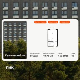 Продаётся квартира-студия площадью 19,7 кв.м на 16 этаже 25 этажного дома (Корпус 9, Секция 1) проекта ПИК Кузьминский лес. Светлый просторный подъезд на уровне земли, функциональная планировка, большие окна, c отделкой.