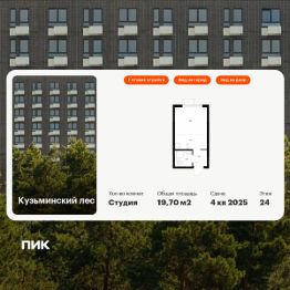 Продаётся квартира-студия площадью 19,7 кв.м на 24 этаже 25 этажного дома (Корпус 9, Секция 1) проекта ПИК Кузьминский лес. Светлый просторный подъезд на уровне земли, функциональная планировка, большие окна, c отделкой.