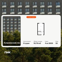 Продаётся квартира-студия площадью 19,7 кв.м на 22 этаже 25 этажного дома (Корпус 12, Секция 1) проекта ПИК Кузьминский лес. Светлый просторный подъезд на уровне земли, функциональная планировка, большие окна, c отделкой.