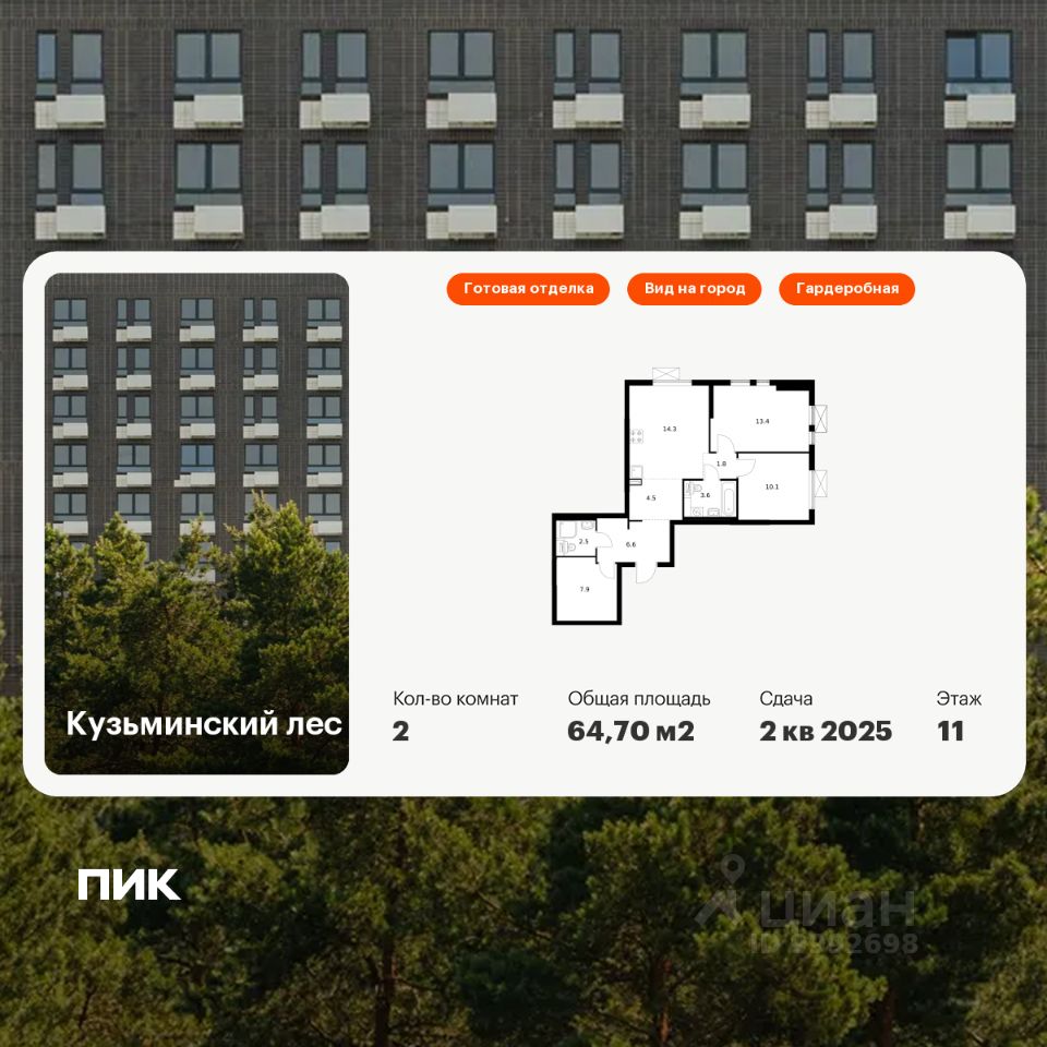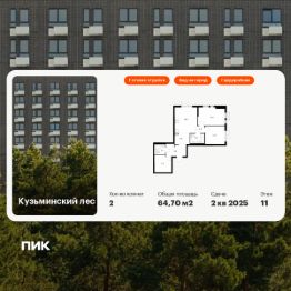 Продаётся 2-комн. квартира площадью 64,7 кв.м на 11 этаже 25 этажного дома (Корпус 10, Секция 1) проекта ПИК Кузьминский лес. Светлый просторный подъезд на уровне земли, функциональная планировка, большие окна, c отделкой.